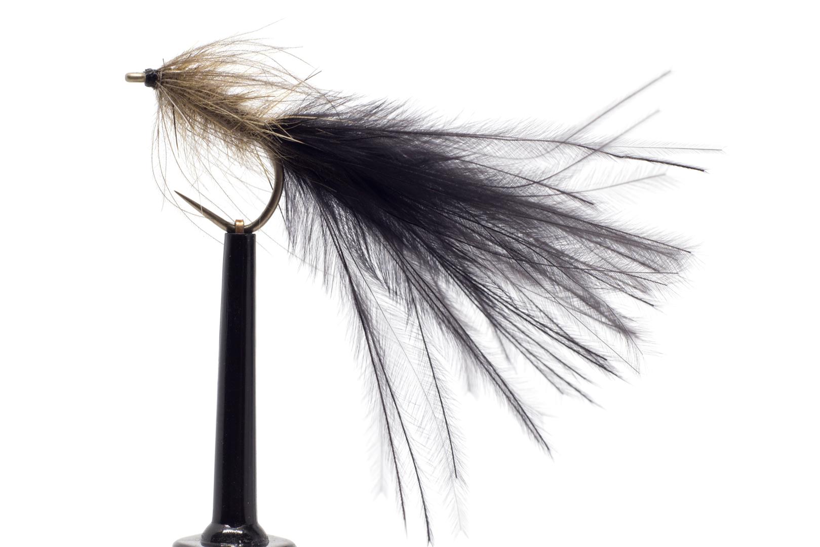 Lehká černá lura bez hlavičky s CDC nožičkami. Přírodní vzor na potočáky a ochytané duháky.