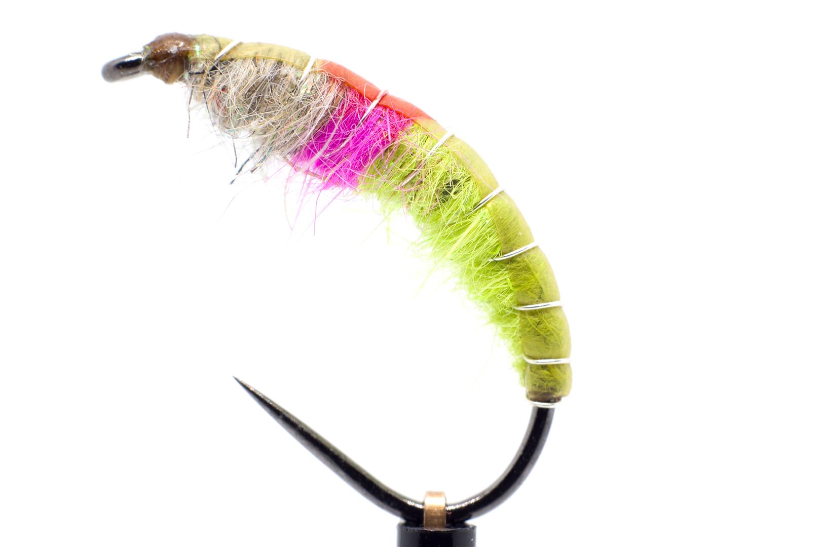 Pestrý vzor české nymfy pro lov v kalné vodě a vysazených pstruhů duhových.