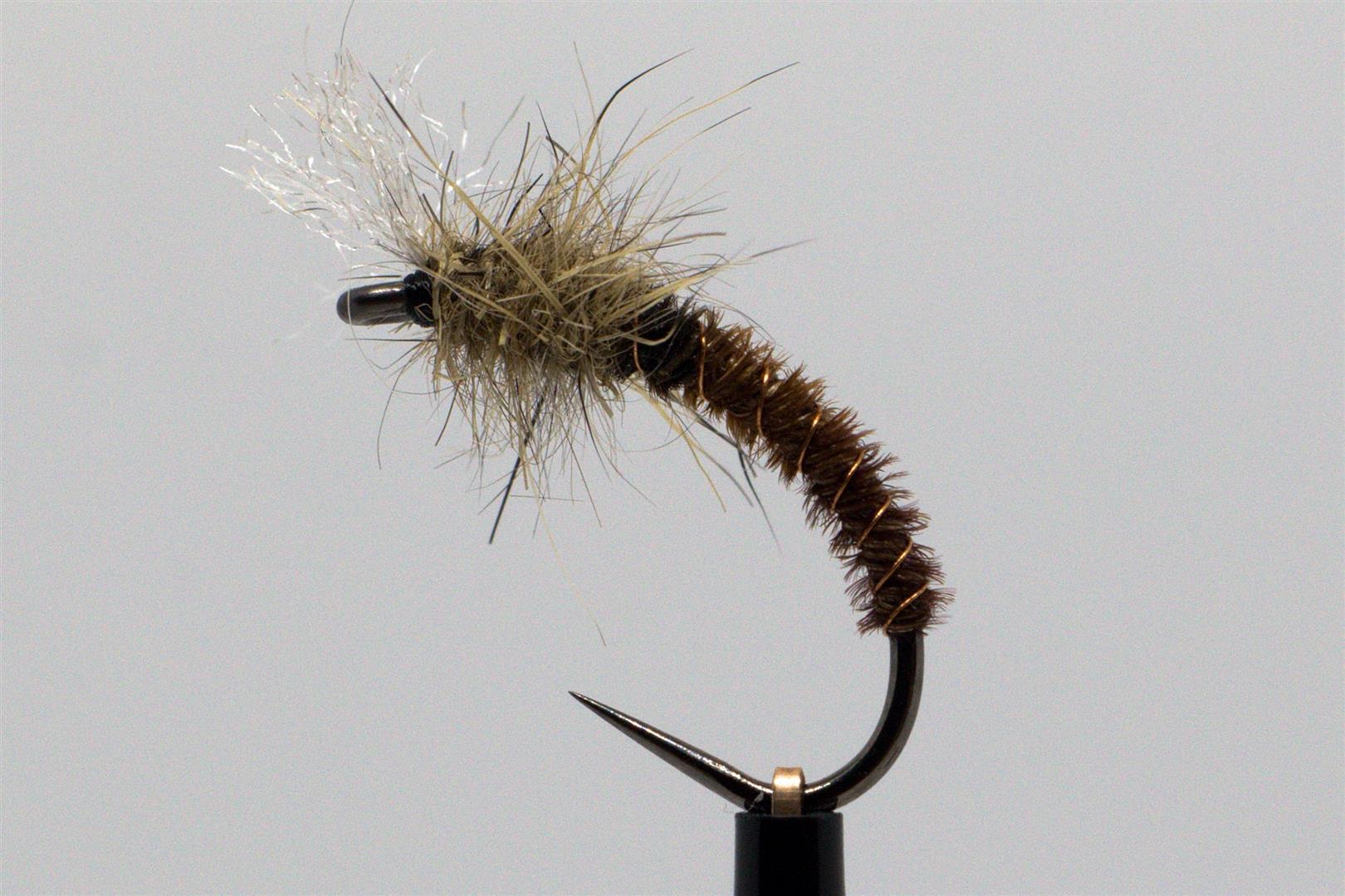 Přírodní vzor pakomára z bažantího ocasu a hrudí ze zajíce. Výborný vzor na ochytané ryby.