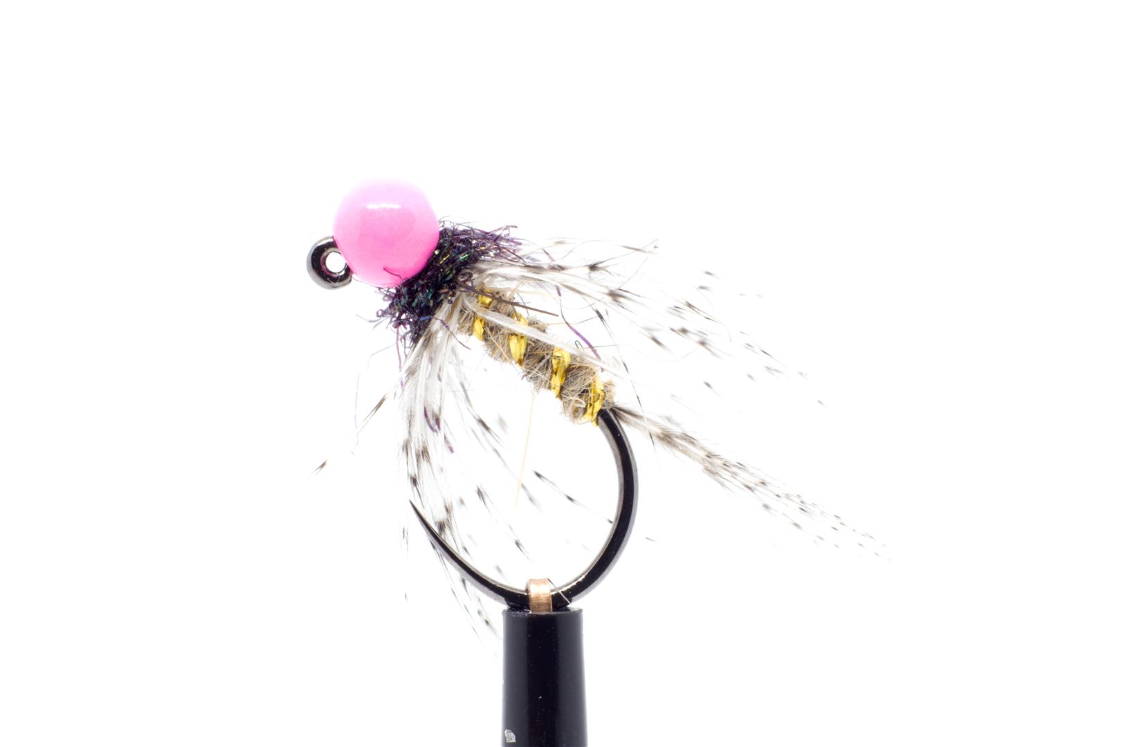 Tungsten se světle růžovou hlavičkou a nožičkami z koroptve. Měkké peří koroptve se ve vodě svůdně vlní a provokuje ryby k záběru.