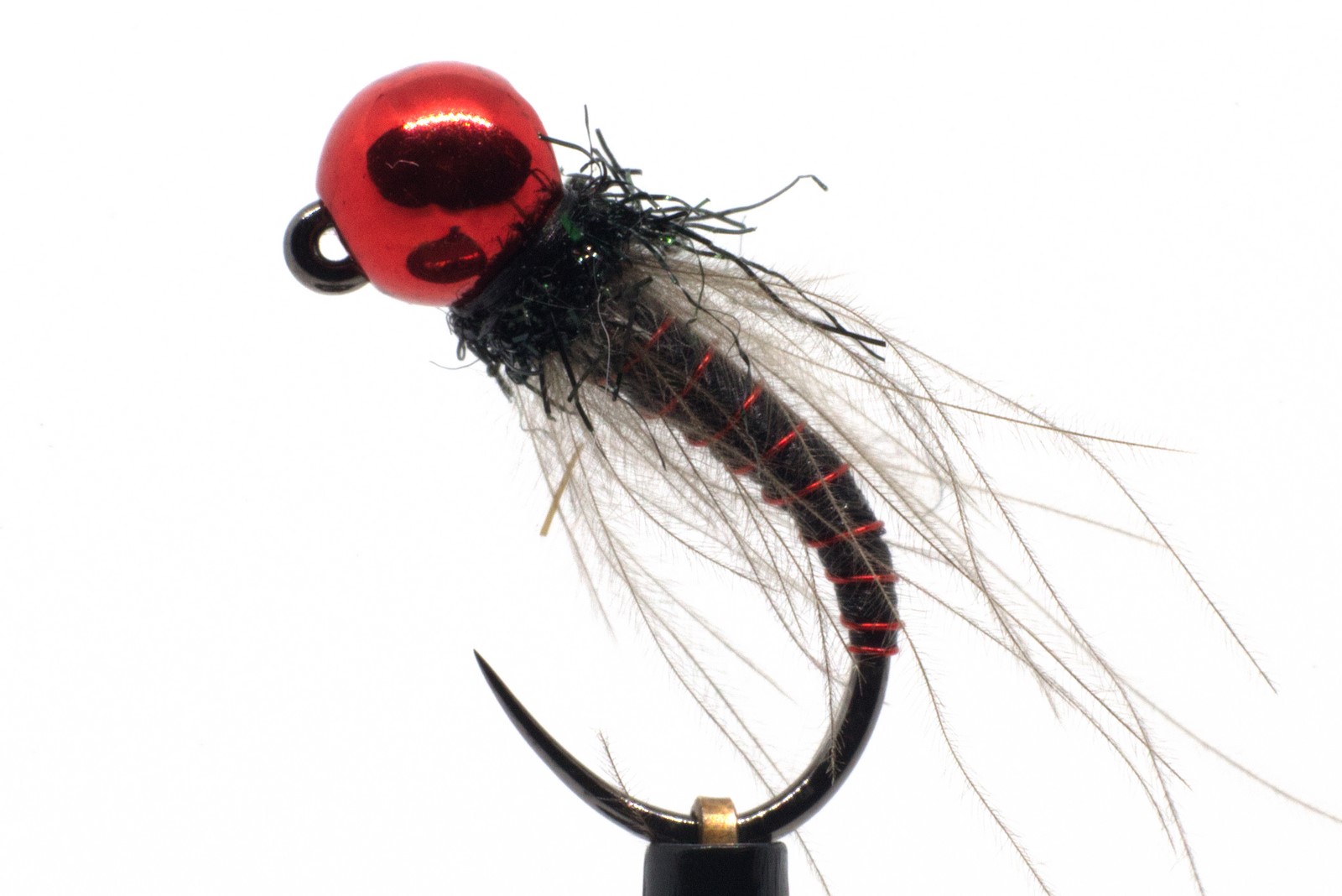 Štíhlá černá nymfa s červeným kroužkováním, límeček CDC + spectra dubbing č.46 a hlavička v metalické červené barvě. Dokonalá moucha pro lov všech opatrných potočáků po celém světě. Doporučujeme vyzkoušet i s odlišnými barvami hlaviček nebo verzi Heavy Body.