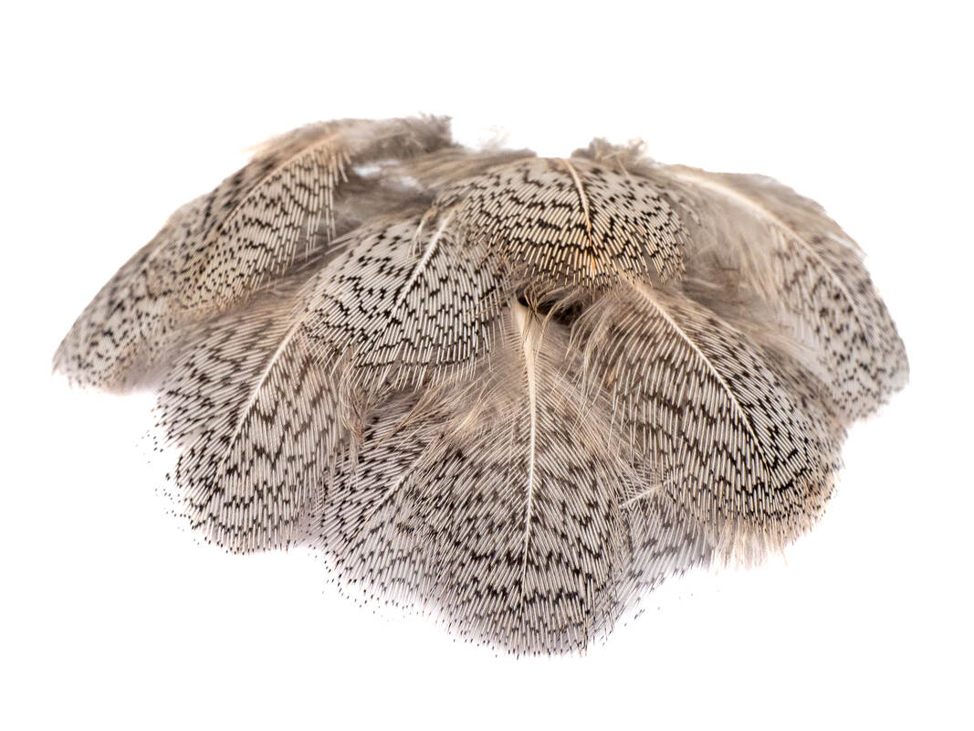 Hrudní kropenaté peří z koroptve, ručně trhané a tříděné. Garantujeme tu nejvyšší kvalitu! Balení obsahuje 30 ks pírek v různých velikostech. Ideální balení pro každého kde nechce kupovat celý skalp.