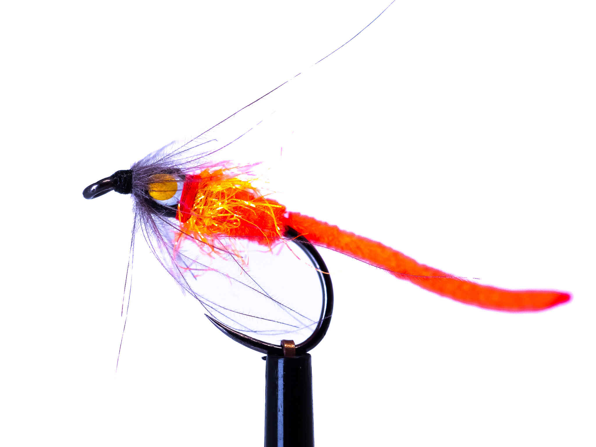 Žížala v ostře oranžové barvě ze šenylky na háčku s nálitkem jungle cocka. Nevšední vzor pro lov především duháků a sivenů na řekách.