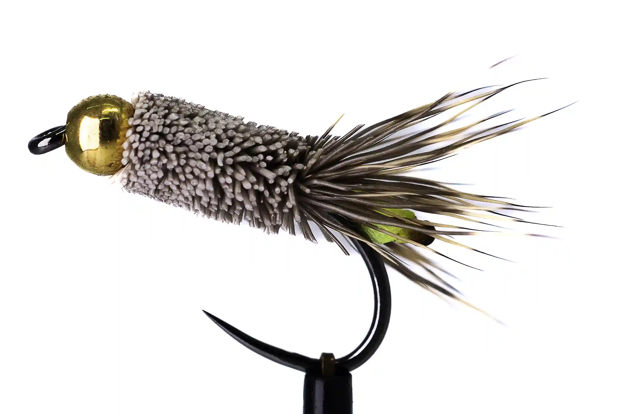 Velice účinný vzor napodobující larvu chrostíka ve schránce s chartreuse konečkem pro lov pstruhů a lipanů v čistých řekách. Na přání lze kombinovat s různými barvami hlaviček.