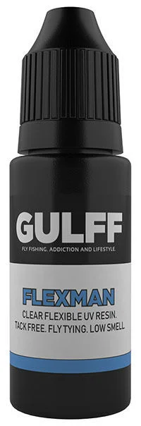 UV Pryskyřice Gulff Flexman. Jedná se o čirou pryskyřici se střední viskozitou, která po vytvrzení zůstane pružná a měkká. Ideální např. pro hlavičky streamerů anebo pro namáhané spoje muškařské šňůry s ujímaným návazcem. Doba vytvrzení je cca 5 vteřin při použití vhodné UV lampy.